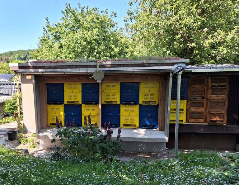 Unser Neu gebautes Bienenhaus hat ein Gründach und fügt sich wunderbar in den alten Obstgarten ein. Der Duft im Bienenhaus nach Honig und Propolis ist einfach himmlisch...